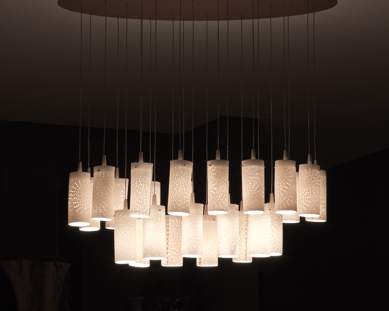 SPARKLING Handmade porcelain LEDlamp. Design Masha van Berkel. A range of decorativ LEDlamps from 2 or 6 units to a impressiv chandelier of 26 units Solid brass housing / transparent coaxial cable 3mm Osram LED module dimmable 7W- 440LM / 2700K / flood 36 Lifetime of the LED module is 50000h - 5 years gaurantee Dimensions 70 x150mm.